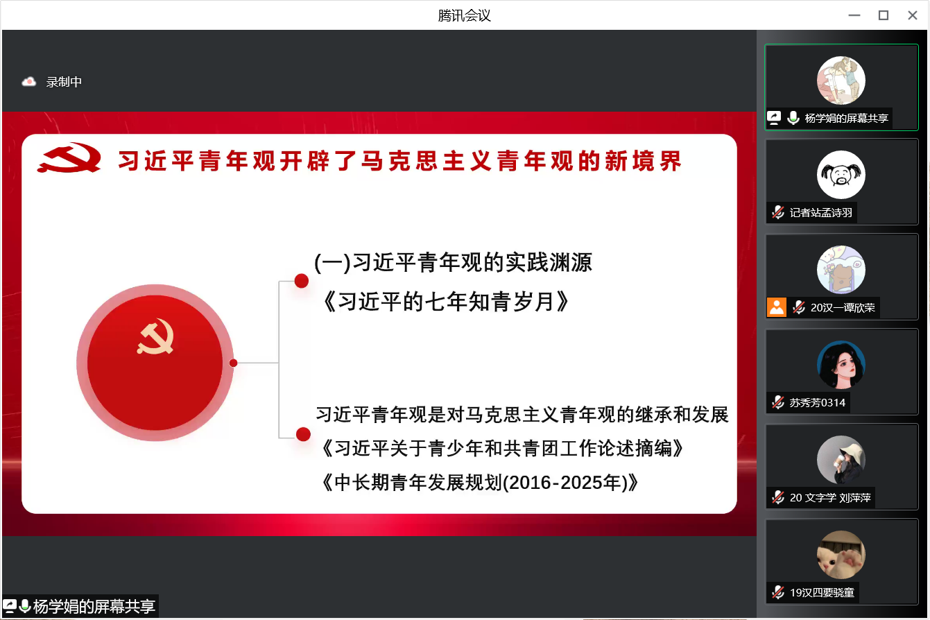 杨学娟老师以“习近平总书记的青年观”为题,从新时代青年的新使命、习近平总书记的青年观实践及其对马克思主义青年观的继承与发展、习近平总书记青年观的内涵等三个部分进行讲解,层层递进,阐释了青年力量的重要性,并为青年一代成长成才提供了切实建议。