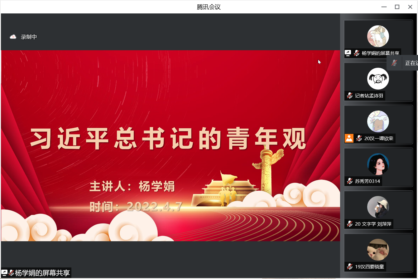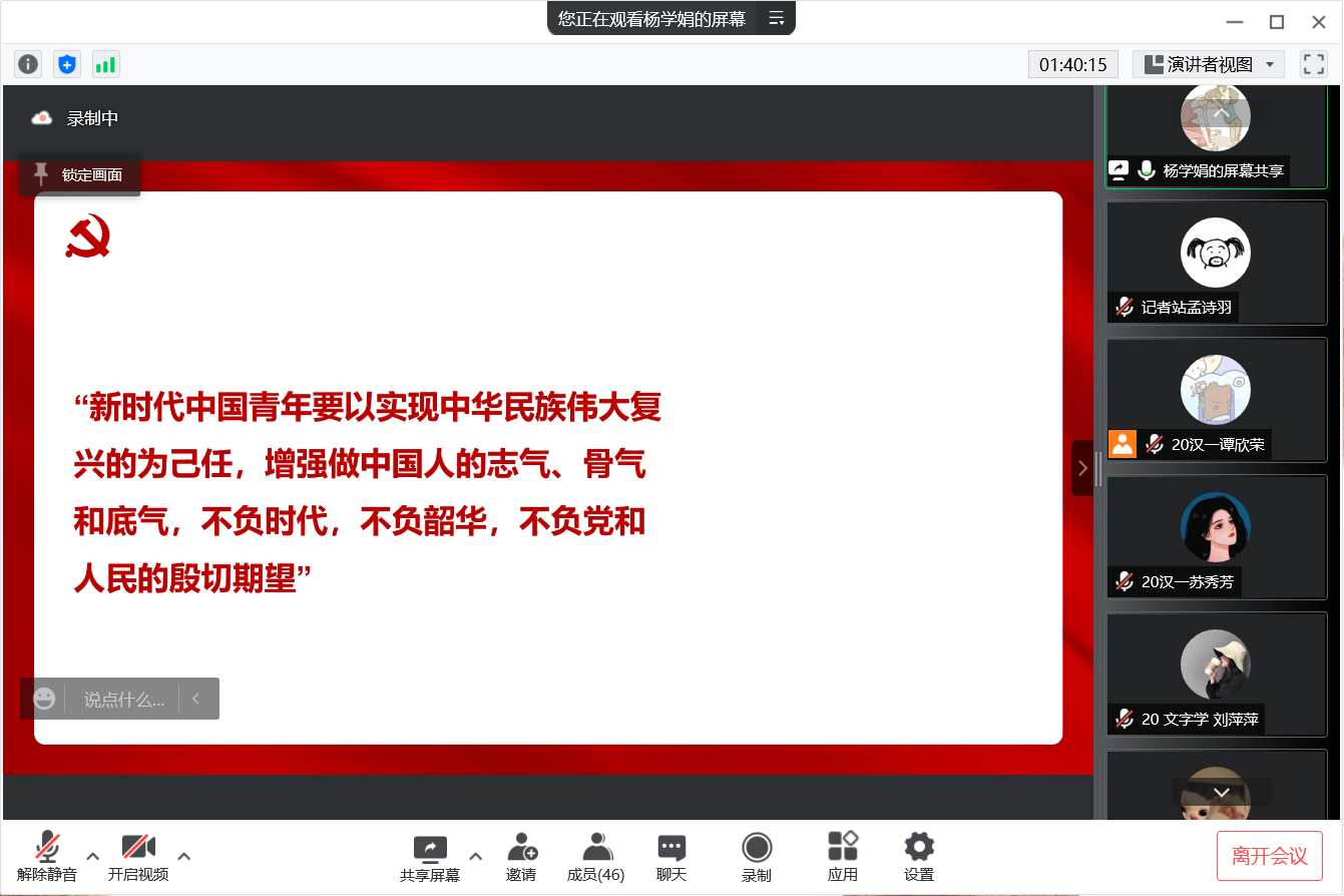 杨老师以现实生活事件为例,讲述了青年应具备的素质与能力。作为时代青年,要坚定理想信念,树立社会主义核心价值观,要练就过硬本领,勇于创新创造,锻炼高尚品格。最后,杨学娟老师以习近平总书记对新时代青年的寄语为结语,希望大家能够勇担时代重任,争做时代新人,不懈奋斗,不负韶华,为国家的进步与发展贡献出自己的一份力量。