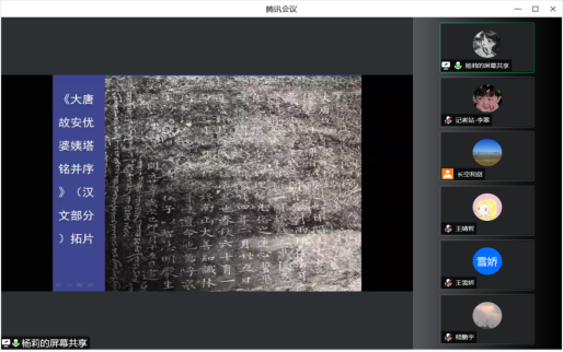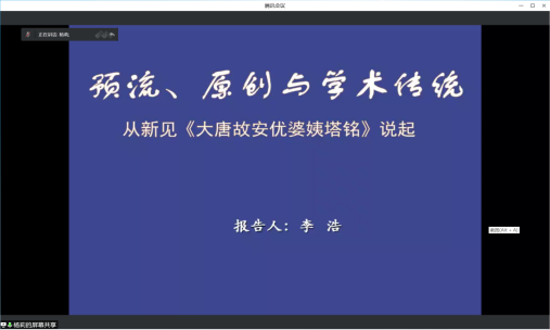 李浩老师以《大唐故安优婆姨塔铭并序》全图拓片作为切入点,讲述了此项学术研究的前期准备工作,通过实地走访,并结合辛维廉教授对粟特文的研究,深入分析其汉文材料。前期准备工作也取得了可喜的阶段性成果,相关的学术成果部分刊载于中国社会科学报,收录于《文献》杂志,并著书出版《摩石录》等。李浩老师及其团队克服了研究过程中存在的问题,如外族语言的转译工作,双语问题等。此外,李老师通过举例说明近几十年西安周边出现的双语墓志,并根据墓志中语言体系的先后排列顺序,指出粟特文和汉语的历史变迁。