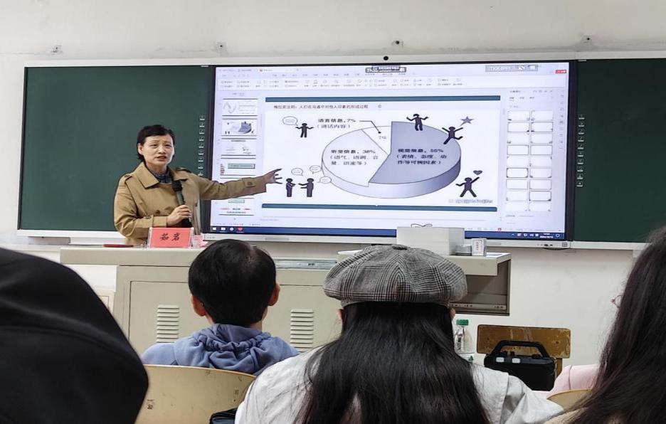 茹岩老师的讲座内容主要涵盖两大部分:一是如何在教学过程中有效地传递和运用真情表达;二是探讨如何实现持久、有力且清晰的发声。讲座伊始,茹岩老师结合情绪周期表,深入浅出地解析了教师情绪变化与其表达效果之间的关联,并引用梅拉宾法则强调了面部表情等视觉信息在信息传递中的重要性。为帮助学生更好地掌握真情表达技巧,茹岩老师提出从“找关系、找场景、找逻辑”三个层面“转化文本”,在此基础上“生成文本”,即从“展示情绪、呈现感受和描述场景”三个层次实现表达目标,提升表达的真实性和感染力。
