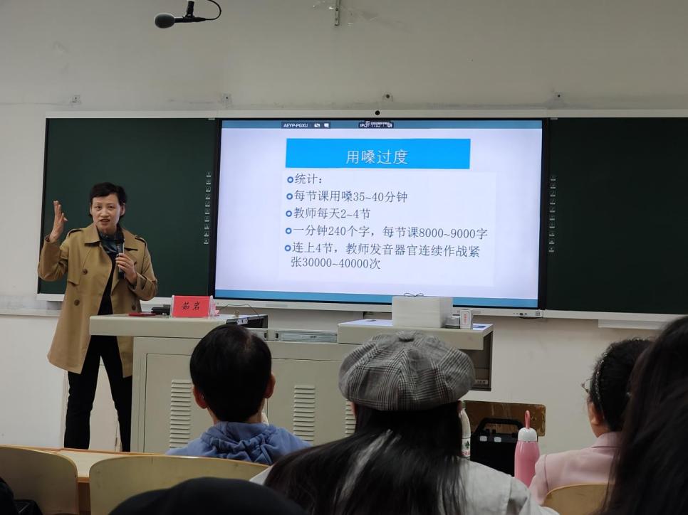 随后,茹岩老师围绕如何在长时间的教学活动中保持声音的质量进行了详尽讲解。针对常见的喉咙干燥疼痛及嗓音嘶哑等问题,茹岩老师分享了一系列实用技巧,如胸腹联合式呼吸法、口腔参与法等,帮助同学们科学用嗓,减轻声带负担。这些方法不仅有助于改善发音质量,还为同学们展示了如何提高自身语言表达的表现力。