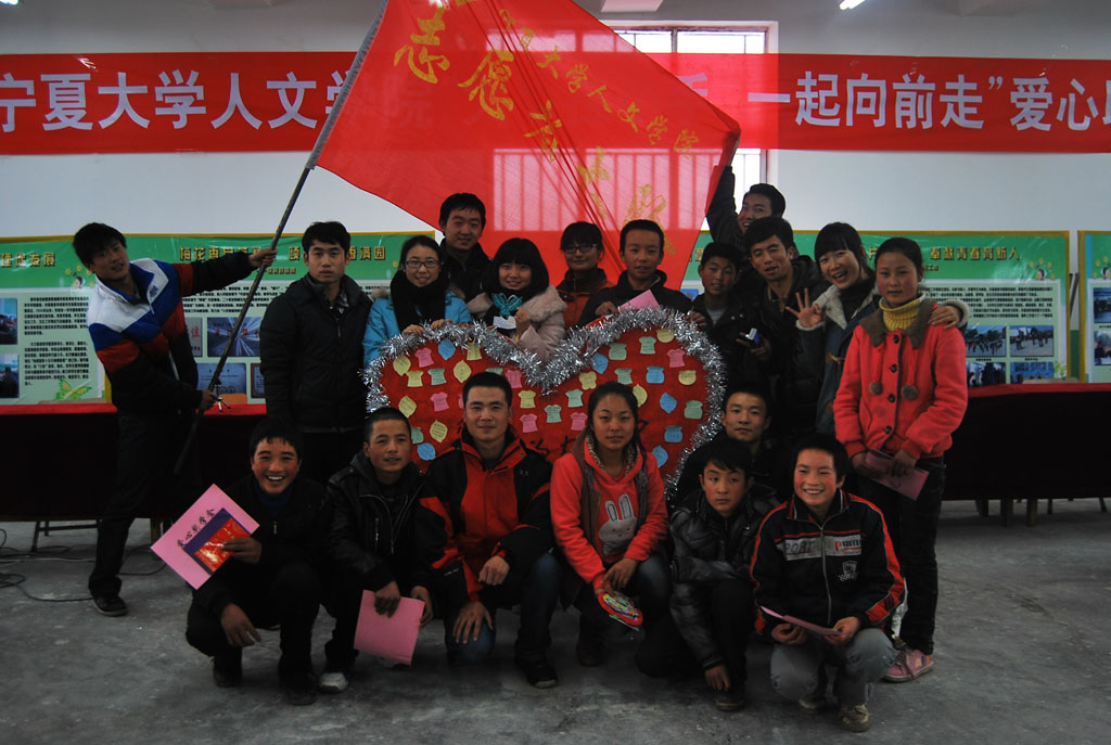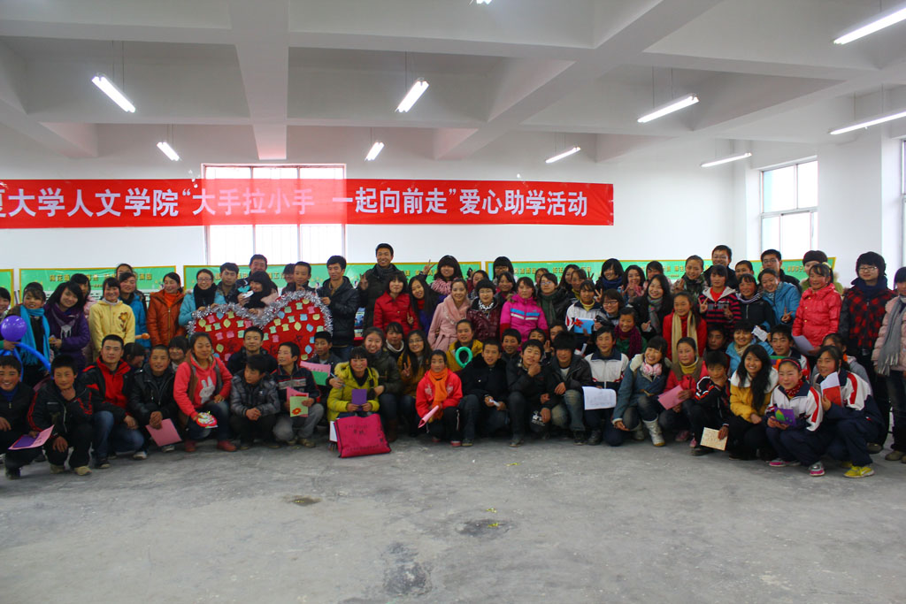 在此期间,大学生与中学生互换贺卡和联系方式,结成“一对一”帮扶对子。泾源县二中的同学们准备了一场小型联欢会,以感恩为主题,节目形式多样,向参与爱心助学活动的师生们表达他们最衷心的感谢。孩子们准备了舞蹈、集体诗朗诵、小品和《感恩的心》手语表演,这些节目都是孩子们利用晚自习时间在一周之内自编自演出来的。在相互交流的过程中,双方同学都热情大方,以各种方式的小游戏将活动的气氛推向高潮。