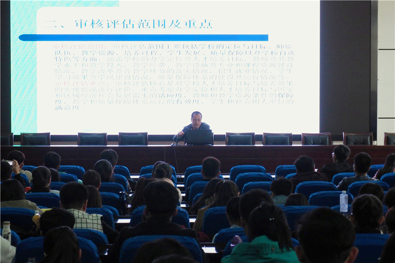 会议首先由刘杰发言,他分别从审核评估总体要求、范围重点和组织与管理以及专家进校考察、在校学生注意事项和纪律要求等七个方面做了详细的阐述。同时,他对学生的个人生活行为、课堂秩序、学习行为等提出了严格的要求。另外,他要求各班班委及时召开有关学习此次大会精神的班会,落实大会提出的各项要求。随后,马小军书记再次强调了本次审核评估工作对于我校的重要意义,并对全体同学提出了“增强主人翁意识,人人参与评估” 、“讲学习,树新风”、“深入学习了解学校的基本状况与本科教学工作的评鉴成果”及“强化细化各项规范,自觉遵守校规校纪”等具体要求。最后,马小军希望同学们不忘初心,牢记使命,要心往一处想,劲往一处使,为促进学校又好又快的发展做出贡献!