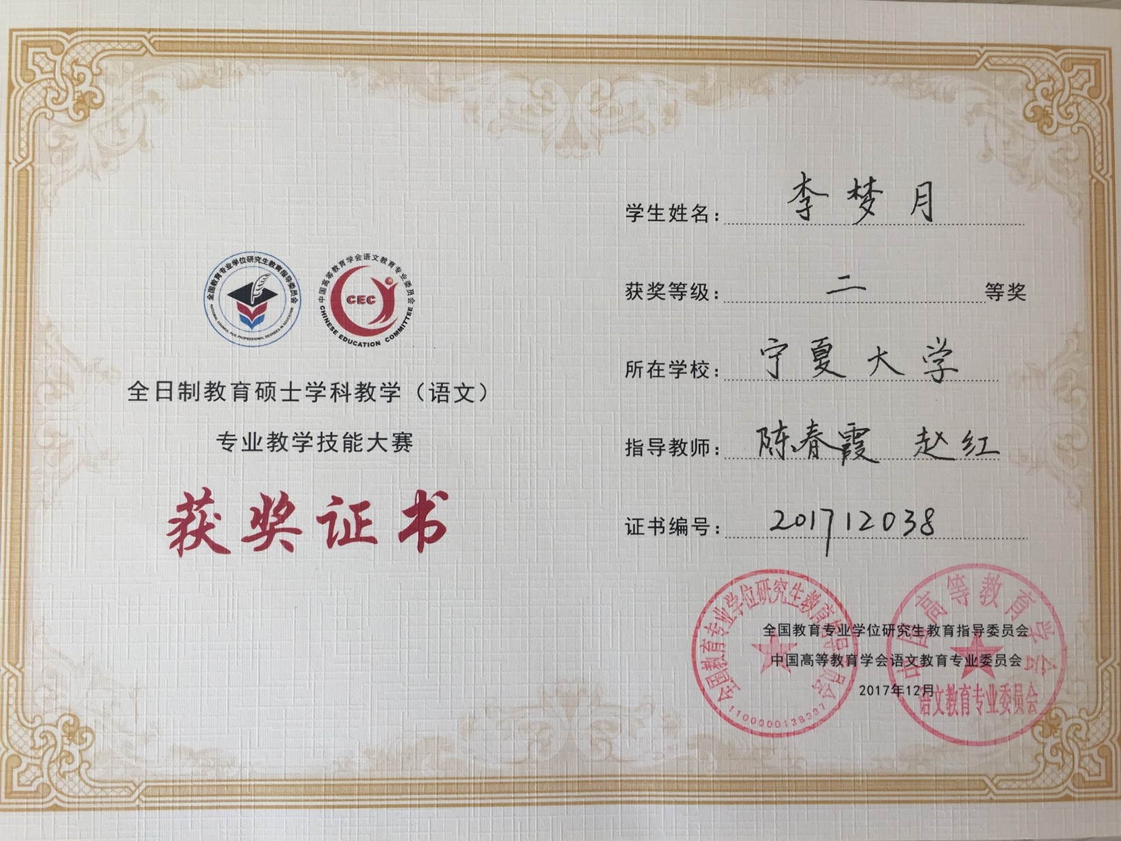 学科教学(语文)硕士点注重培养学生的教学实践能力,指导研究生参加各类教学技能大赛。2017年11月,2017级学科教学(语文)专业的姚心瑞、杨景瑶、安灵童在宁夏高校教育硕士教学技能大赛中分别获得了二等奖两项,三等奖一项的优异成绩。大赛提升了教育硕士的教学实践能力,也为高校教师交流教学经验、展示学子教学风采提供了平台。