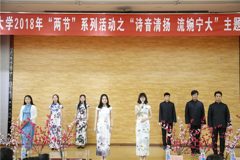 文人墨客,齐聚一堂,赋诗吟词,无问西东。“有质量、有内涵、有时代气息的校园文化需要师生的共同努力,高雅的活动亦需要形式上的创新和开放包容的理念做支撑”,诗会在校团委冯学文副书记的这段精彩致辞中拉开帷幕。接着,但见瓢中清,翠影落群岫,宁大爱心茶室以杯杯佳茗敬奉师友,为此次诗会献礼。之后,白鹭诗社的一曲《礼仪之邦》,以诗情述说我大中国礼仪之风,为后续节目精彩开场。你看,那是马上少年郎的英姿;你听,那是一曲长恨歌的哀怨;再回首,那又是一世一双人的凄婉。恍惚间似将我们带入了那河畔之间,品流觞曲水之雅兴;又好像将我们带入了那烈烈少年的英姿之中,味华夏青年之壮志豪情。《落笔一幽兰,难描虎贲情》,柔情与壮志交融,温婉与灵动相生,带给大家别致的诗韵。中场时分,由朗诵名家马利荣、李爱荣和汪伟民分别带来的《花朵盛开的村庄》和《春天,遂想起》,仿佛一场场视觉的饕餮盛宴,余韵悠长,耐人寻味。清新淡雅的《雨巷》带领大家走进了江南烟雨的小镇,深情地吟咏描绘了一幅动人的画面,缠绵哀婉,古色古香。最后,诗会在集体诗朗诵《凤凰涅槃》中落下了帷幕,笔锋流转里,落于纸上的是激扬文字;深情吟咏中,滞于心间的是恒久的诗情画意。