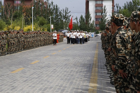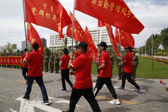 活动伊始,两千教职工身着整齐鲜艳的上衣,齐聚怀远校区足球场,接下来,便是慰问各军训团的活动,整场活动洋溢着紧张而青春的氛围。当时,正值正午两点,烈日当空,骄阳似火。贺兰山校区东门东西向的大路上,两排笔直的“青松”屹立,那正是人av女优
