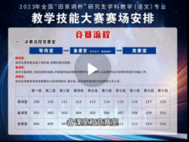 2023年度的决赛赛制难度提升,选手按照要求从统编版初高中的11本教材中随机抽取课文,完成不超过15分钟的现场教学和5分钟的随机问答。在不携带任何教学参考资料封闭备课两小时后,进入竞赛场地,提交教学设计和PPT课件,并完成现场教学和问答。决赛过程充分考查学生的专业知识、教学技能、教学设计和良好的综合素质等综合能力。以下为竞赛流程,每组选手有自己的等待室、备课室和竞赛室。