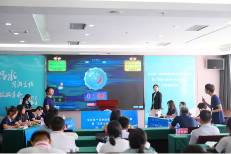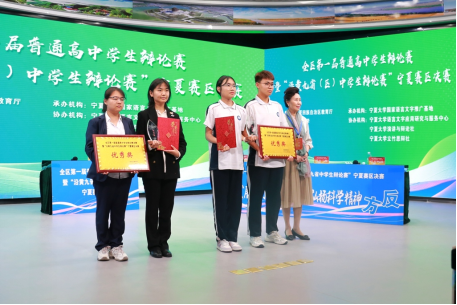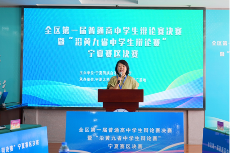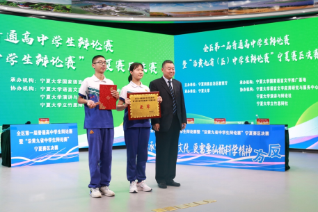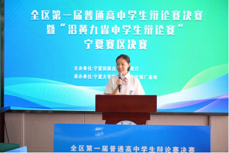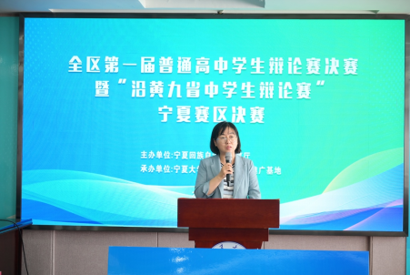 孙姝源同学担任比赛主持人。经过激烈交锋,最终中卫市第一中学捧获决赛冠军奖杯。获得冠亚军的中卫市第一中学和宁夏银川一中,将代表宁夏高中学校出征8月份在山东举办的沿黄九省普通高中学生辩论赛。