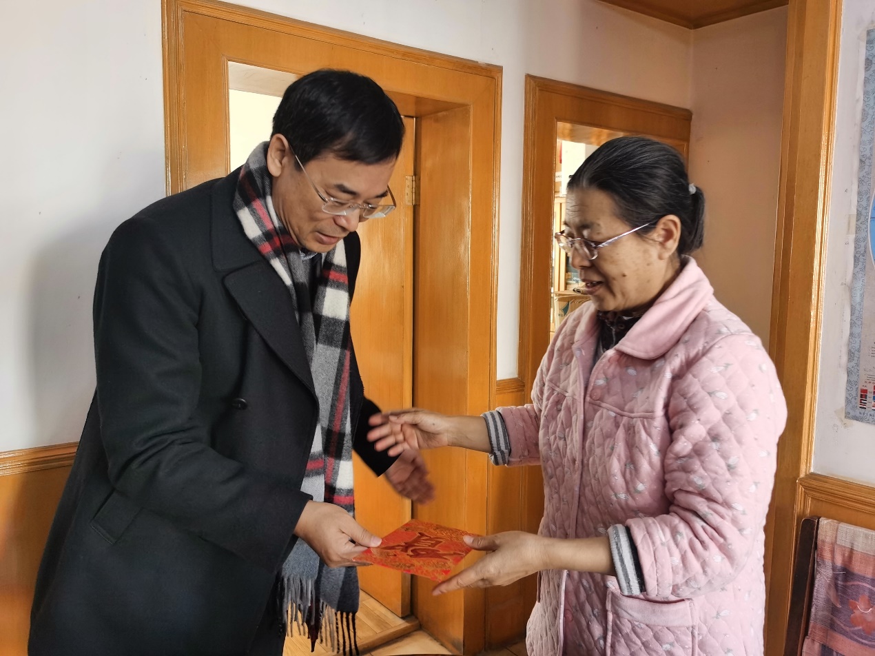 在 中国传统的新春佳节来临之际,1月15日,学院领导张培松、胡玉冰与其他院领导一道,分两组分别带领院工会、院办人员慰问了王庆同、刘继德、田美琳、钱志和、马丽珠、谢式燕、赵慧、冯霞、惠继东、刘志虎等十位退休教职工,为他们提前送上了美好的新春祝福,祝愿老教师身体健康,阖家幸福。